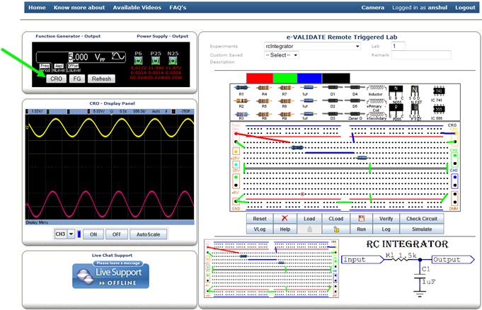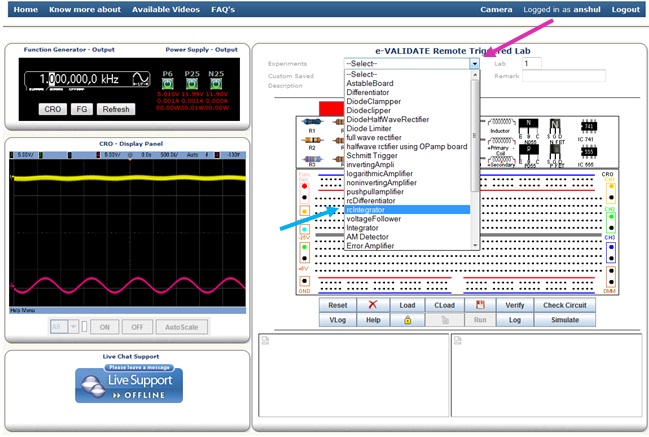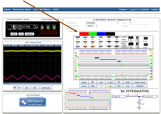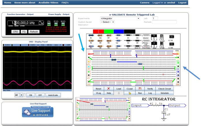 After selecting the experiment you will see the schematic and breadboard circuit diagram. The bread board circuit diagram is an example how to connect components on board. Student can connect the components by drag and drop process. Before starting, you should click on Lock button, by doing this your slot time will be locked which means only you have access to the hardware at that time.