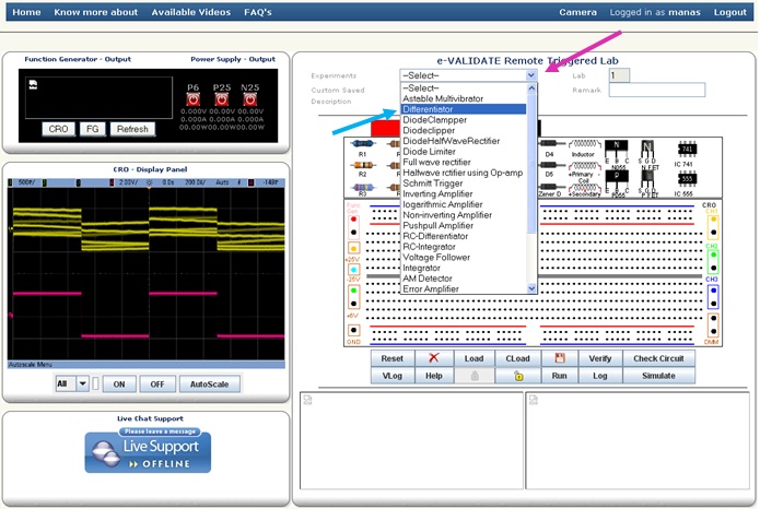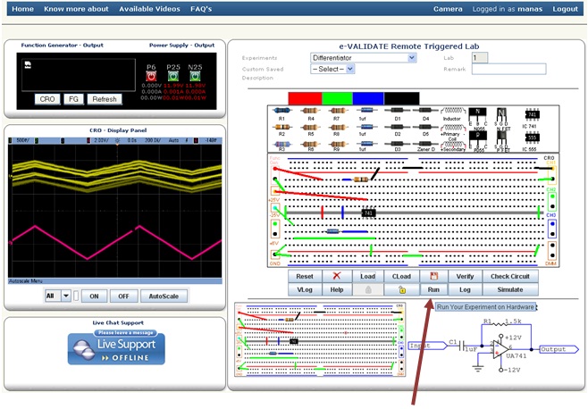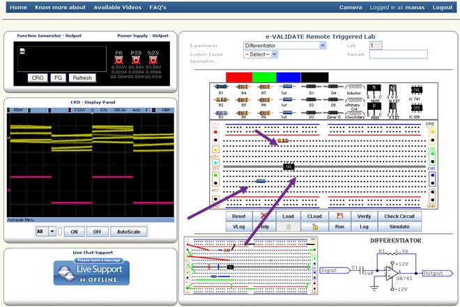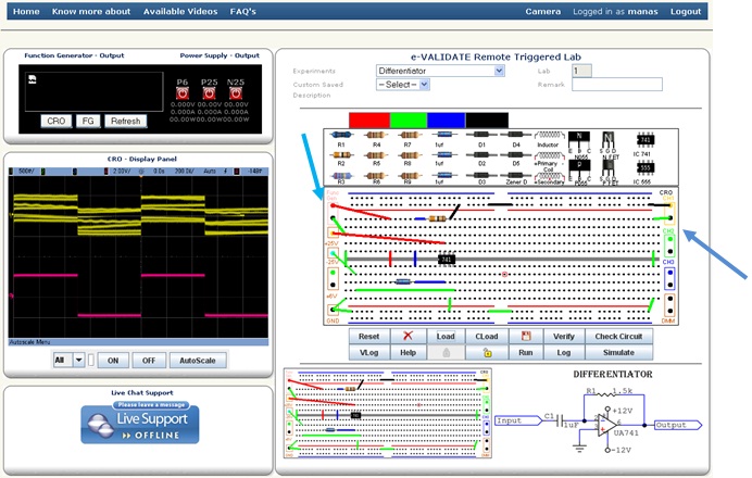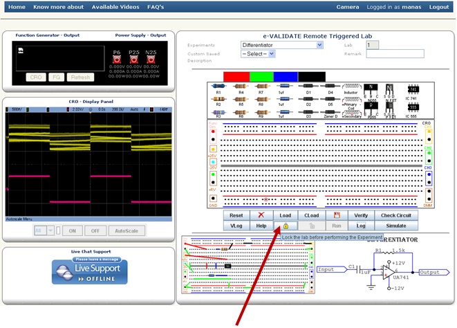 After selecting the experiment you will see the schematic and breadboard circuit diagram. The bread board circuit diagram is an example how to connect components on board. Student can connect the components by drag and drop process. Before starting, you should click on Lock button, by doing this your slot time will be locked which means only you have access to the hardware at that time.