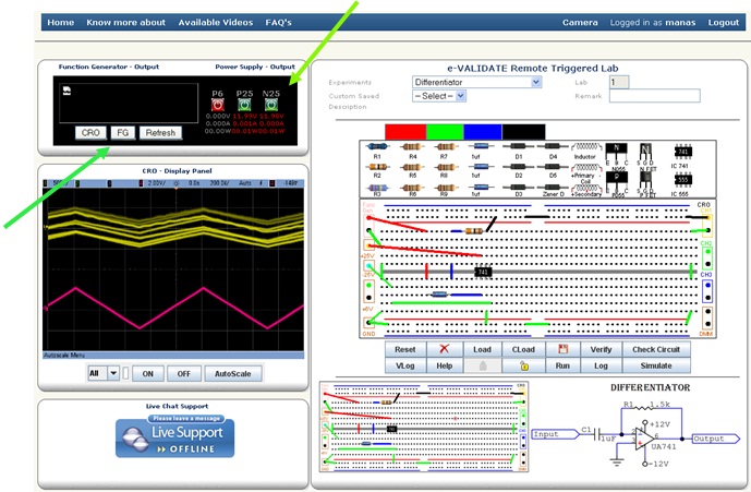 After implementation of components on bread board, student must have connect function generator for providing Input signal, Power Supply for providing power to circuit, these are on left side of bread board. Three different channels are available for seeing the output at right side of the bread board. The green wires are of the ground connection.