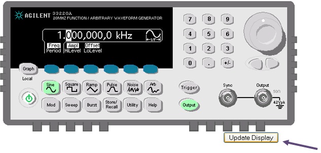 When all the components are connected properly, student should click on FG (Function Generator), After clicking on FG , a new window of function Generator will be appear, The all value like as amplitude, frequency, wave (sine, square, ramp, etc.) and DC offset should be proper and with its unit, after that click on Update Display.