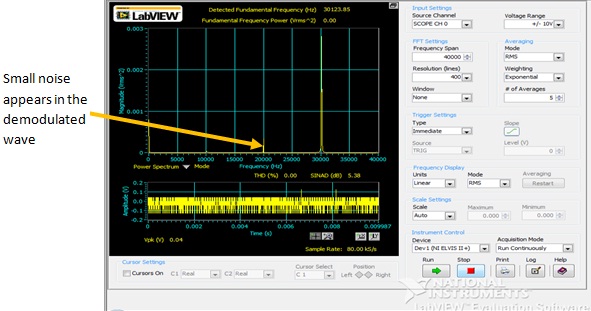 The input & output waveforms can seen in the Fig.1. The green one is o/p signal with SSB-SC as blue signal given to the demodulator & recovered back both the side bands i.e. USB & LSB.