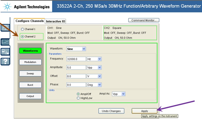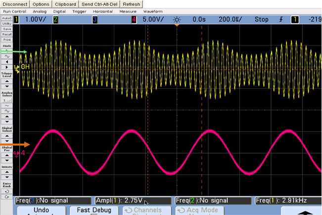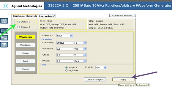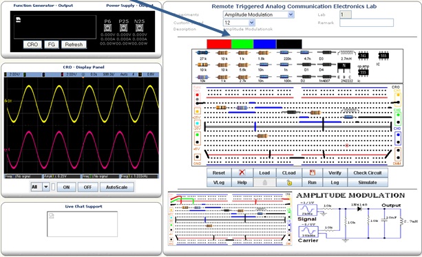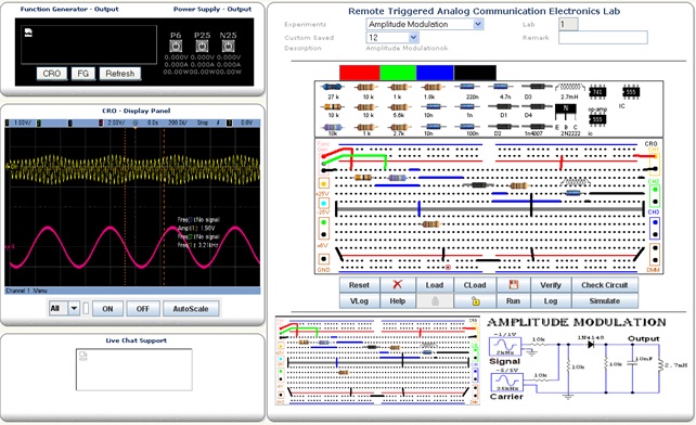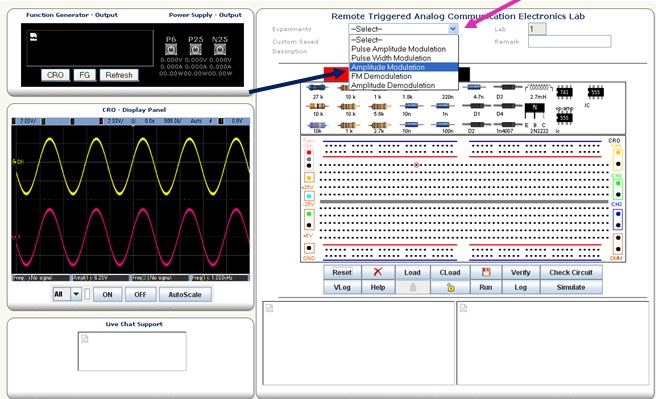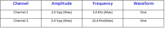 When all the components are connected properly, student should click on FG (Function Generator), after clicking on FG, a new window of function Generator will appear, this Function Generator have two different channels to provide two different signals at a time simultaneously. Channel 1 is using as Signal and channel 2 is Carrier for this circuit.