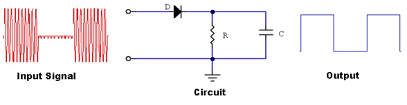 The circuit relies upon the behavior of the diode allowing current through when the input is positive with respect to the capacitor voltage, hence topping up the capacitor voltage to the peak level, but blocking any current from flowing back out the diode when the input is below the capacitor through the current they pass varies the applied voltage, as a result the modulated output is slightly distorted in a way which depends upon the diodes I / V characteristics. The circuit also suffers from the problem known as ripple and negative peak Clipping. The ripple effect happens because the capacitor will be discharged a small amount in between successive peaks of the input ASK wave.