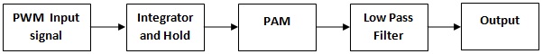 There are two common techniques used for pulse-width demodulation. One method is that the PWM signal must first be converted to a pulse-amplitude modulation (PAM) signal and then passed through a low-pass filter. The PWM signal is applied to an integrator and hold circuit. When the positive edge of pulse appears, the integrator generates ramp output whose magnitude is proportional to the pulse width. After the negative edge, the hold circuit maintains the peak ramp voltage for a given period and then forces the output voltage to zero. The waveform is the sum of a sequence of constant-amplitude and constant-width pulse generated by demodulator. This signal is then applied to the input of clipping circuit, which cuts off the portion of signal below the threshold voltage and outputs the reminder. Therefore the output of clipping circuit is a PAM signal whose amplitude is proportional to the width of PWM signal. Finally, the PAM signal passes through a simple low-pass filter and the original audio signal is obtained.